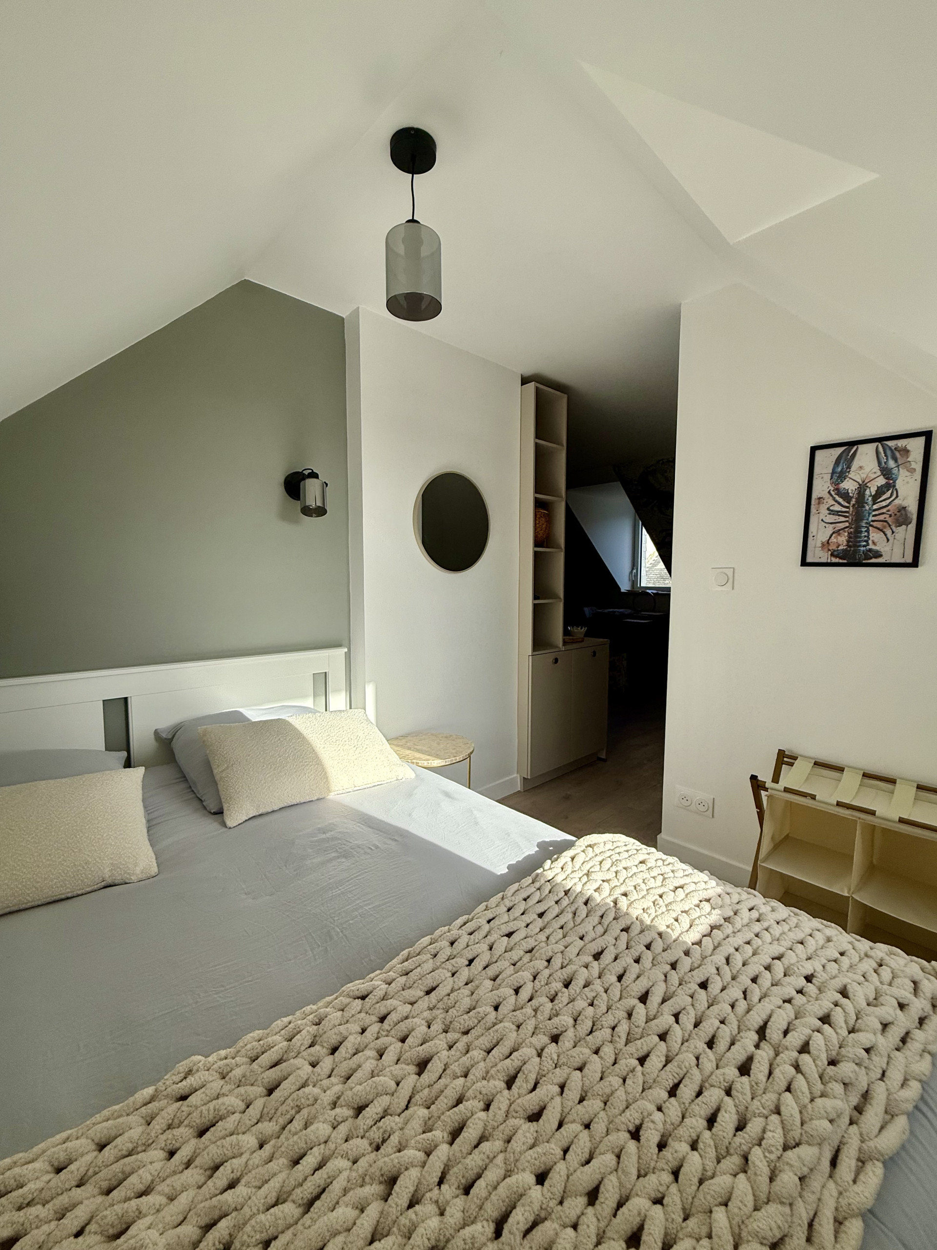La chambre dispose d’un lit de 160 coffre, pour vous permettre de ranger vos valises. La literie est neuve elle a été choisie avec soin pour que vos nuits soient douces.